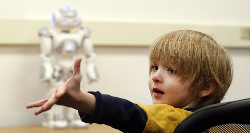Researchers at Vanderbilt University have designed Russell the robot (background). It helps teach kids with autism, like this young boy, how to imitate people and to interact with them.
