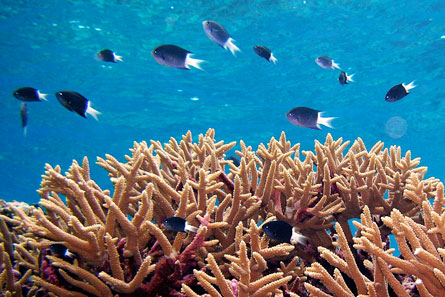 Small bicolor damselfish swim above a patch of Acropora coral in the Line Islands.