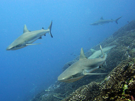 Gray reef sharks swimming over a live coral reef in the Pacific Ocean’s Line Islands.