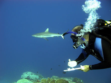 Scientist Alan Friedlander of the U.S. Geological Survey takes notes while a gray reef shark in the background.