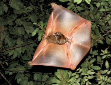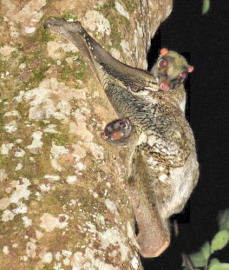 Two colugo species may be the closest living relatives to modern primates. Above, a Malaysian colugo mother shelters a youngster. Below, a colugo leaping off a tree snaps open a membrane that allows it to glide a long way to the next tree.