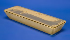 Banks and gold markets can use gold bars for transactions. This bar weighs about 27 pounds and is roughly 6 inches long, 3 inches wide, and 2 inches thick. At current prices, it’s worth more than a quarter of a million dollars. |