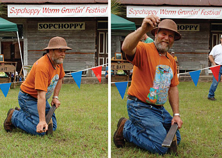 At the 2008 Sopchoppy Worm Gruntin’ Festival in Florida, expert Gary Revell demonstrates the traditional art of hunting worms by rubbing metal over a wooden stake in the ground. The technique makes vibrations in the ground that sound like grunting, or a mole burrowing. This sends worms running.