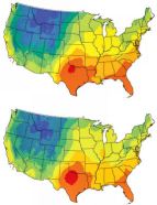 These maps illustrate how the concentrations of certain hydrogen isotopes (top) and oxygen isotopes (bottom) in water differ throughout the United States. Red areas are where concentrations of these isotopes are highest. Blue points to regions having the lowest concentrations.