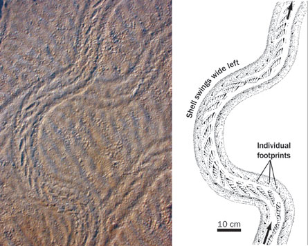 When the scientists looked at the fossilized tracks, they found something strange. Some of the tracks included an extra mark alongside the footprints. Whenever the tracks turned, to the right or to the left, the extra mark swung out a little wider, always to the left. The scientists realized this mark could not have been made by a tail, because a tail would swing out wider on both sides. If the animal turned left, a tail
