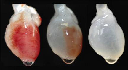 By running a liquid detergent through a rat’s heart (left), researchers gradually washed out its cells (center). What remained was a shell of the heart, made up of proteins (right). |