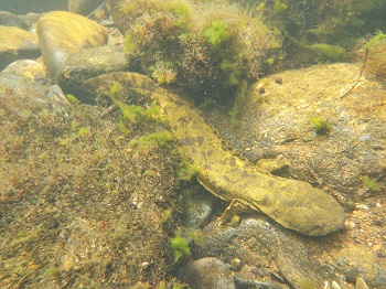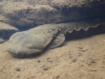 While the water around them flows fast, adults generally stay put. Except for mating season, hellbenders usually hang out under large river rocks. They feast on crawfish or other tasty treats that swim by.