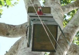 Macaws normally nest in cavities in very large, old trees. At Tambopata, researchers hang artificial nests from big trees for the birds to use.