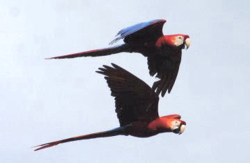 Macaws, which ordinarily mate for life, are often seen flying in pairs.