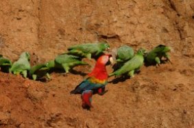 Macaws and other parrots in Tambopata like to eat dirt. The dirt contains special, salty clay that may help the birds get rid of toxins in their diets.