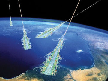 This illustration shows the shower of particles produced when Earth’s atmosphere is struck by ultra-high-energy cosmic rays (the most energetic particles known in the universe). |