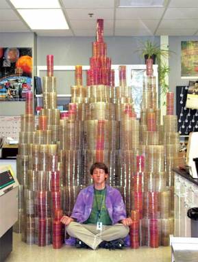 Zachary Blount sits in front of a tower of petri dishes. He used these dishes to test trillions of bacteria to see which evolved the ability to eat a chemical called citrate.