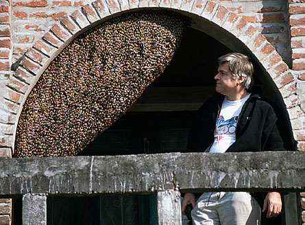 Bee researcher Gerald Kastberger stands next to a giant honeybee nest.