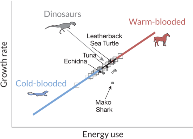 Scientists plotted the growth rates and energy use of 353 modern animals and 21 dinosaurs. Those suggest dinos were more like tuna and some sea turtles than cold-blooded reptiles (see blue end) or warm-blooded mammals (red end of spectrum).