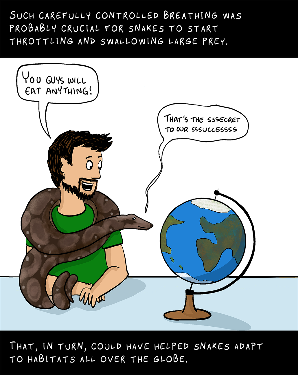 “They can basically just breathe wherever they want,” Capano says. This ability was probably crucial for early snakes to start throttling and swallowing large prey, he adds. That’s important. Why? Snakes’ ability to eat big prey is thought to be a key reason these animals have adapted to so many habitats. Snakes are some 3,700 species strong. And they’re found on six continents.