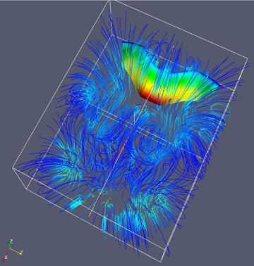 This computer-generated image shows how a bat’s flight alters the flow of the air in the wind tunnel. The blue lines behind the bat (which appears to be multicolored) are streamlines that show how the animal’s motions have disturbed the air. |
