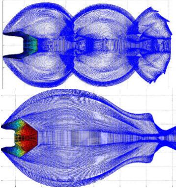 Computer simulations show how air flows around a bat’s wing while the animal is flying slowly (top image; at about 7 miles per hour) and more quickly (bottom; at about 16 miles per hour). |