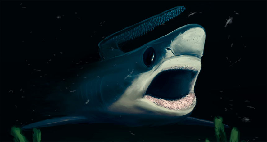 Artist’s drawing of what one of the mini-survivor sharks would have looked like. Notice the tiny teeth and big, hooklike protuberance over its head.