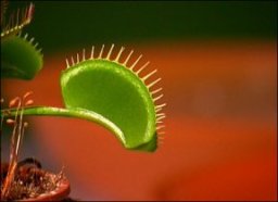Tickling the inner surfaces of an open Venus flytrap leaf causes the leaf to snap shut. |