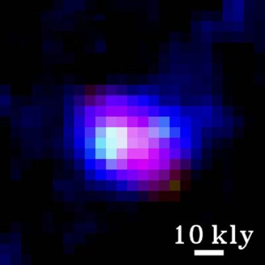 This blob of glowing gas and stars (shown in a false color image) is from roughly 13 billion years ago, a time shortly after the universe formed. In the bar shown for scale, 10 kly stands for 10,000 light-years.