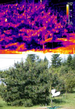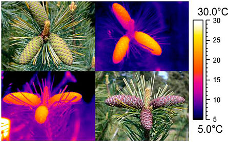 Western white pine cones light up when seen through an infrared camera. Even under cloudy conditions, the cones run 15 degrees Celsius warmer than the surrounding needles.