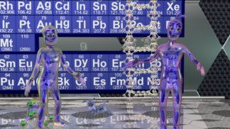 In an animated NanoKid adventure, two NanoPutians welcome a newcomer to the NanoLoft, a nanoscale hangout in a computer’s jungle of circuits and transistors. The background shows part of the periodic table of elements, the building blocks of matter.