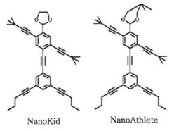 NanoKid consists of 39 carbon atoms, 42 hydrogen atoms, and 2 oxygen atoms. NanoAthlete is made up of 42 carbon atoms, 48 hydrogen atoms, and 2 oxygen atoms. These diagrams show the two molecular structures. Each line segment indicates a chemical link, or bond, between atoms. The two Os stand for oxygen atoms. Carbon atoms are located at each corner or intersection in the diagrams. |