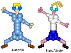 NanoKid, for example, consists of 39 carbon atoms, 42 hydrogen atoms, and 2 oxygen atoms. It stands about 2 nanometers tall. NanoAthlete is made up of 42 carbon atoms, 48 hydrogen atoms, and 2 oxygen atoms. NanoAthlete stands a little taller than NanoKid.