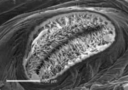 Closeup of a beetle’s spiracle. The white bar represents 100 micrometers, or about the thickness of a human hair. |