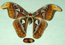 Researchers worked with the pupal stage (bottom) of an Atlas moth, the adults of which can grow to some 6 inches in width. |