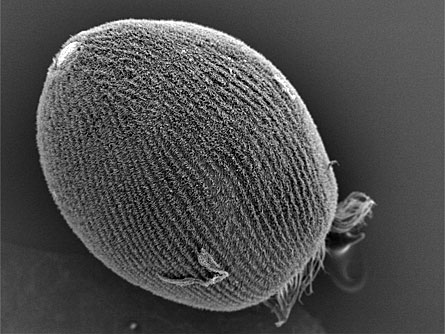 Shown is the larva, or young, of the same species of sponge pictured as an adult. About the size of a grain of salt, this tiny creature was seen through an electron microscope.