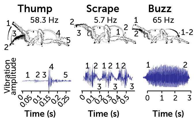 Elias measures the vibration of the nylon surface and translates it into something people can hear. This reveals an acoustic barrage of thumps, scrapes and buzzes. At the same time, Elias records video of the courtship in slow-motion. This lets him later study how the male’s sound and motion sync up. The male, he finds, performs what’s essentially a miniature drum solo — one perfectly matched to his flicks and kicks.