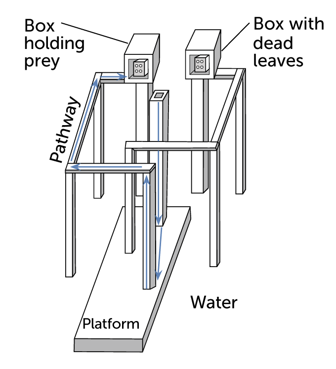 In one, they place a spider atop a tower on a platform (shown here) surrounded by water. Jumping spiders will avoid water whenever possible. From the perch, the spider can see two other towers. One is topped with a box containing prey. Another has a box of dead leaves. Both can be reached from the platform by a raised walkway with multiple turns. After viewing the scene, most spiders climb down the tower and choose the correct path to the target — even when that requires initially heading away from the target, losing sight of the prey, and first passing the start of the incorrect walkway.