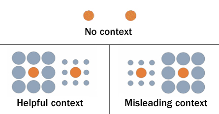 If an orange circle is surrounded by smaller gray circles, then it appears larger than it really is. If an orange circle is surrounded by larger gray circles, then it appears smaller than it really is.