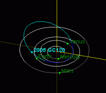 This diagram shows the orbit (blue) of a recently discovered, potentially hazardous, near-Earth asteroid known as 2005 GC120. It gives the positions of the asteroid, Earth, Mercury, Venus and Mars on May 4, 2005.