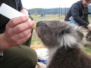 In January 2007, a fire destroyed koala habitat and killed or injured many of the animals. Wildlife rehabilitators treated injured koalas (above) and looked after them during their recovery (below).