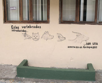 This mural on the island of San Cristobal reads, “These introduced vertebrate animals are a menace in the Galápagos.” Pictured are a rat, cat, dog, pig, and goat—among the most destructive newcomers in the Galápagos Islands.