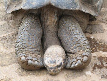This male tortoise was once kept illegally as a pet. Now, he stretches out at the Charles Darwin Research Station on Santa Cruz Island.