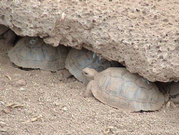 These tortoise hatchlings are a few years old. Here, they seek shelter from the heat at the Charles Darwin Research Station on Santa Cruz Island in the Galápagos. Researchers have bred these hatchlings in captivity and will release them into the wild once they reach their fifth birthday.