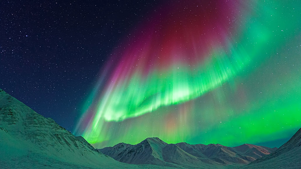 Auroras, like this one seen above Alaska, arise when energetic particles from space rain into our atmosphere.