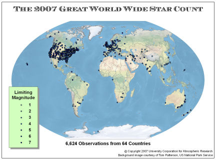 Dark spots on the map, above, show the locations of people who participated in the first annual Great Worldwide Star Count. Over 2 weeks, people in 64 countries made 6,624 observations. |