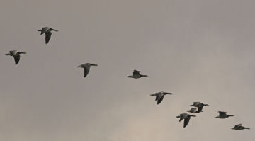 As the sun sets in Finland, Barnacle geese fly south on their annual autumn migration. Bright city lights can distract and harm traveling birds. |
