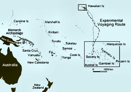 This map shows the Polynesian Islands, with the eastern islands contained in a box. The dotted line traces the 1976 route of a Polynesian-style canoe that made a round trip between Hawaii and Tahiti. |