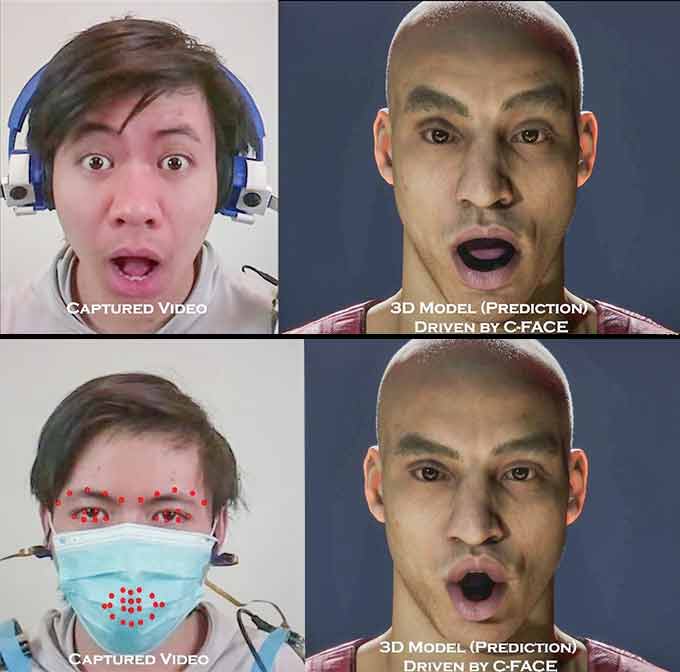 To train C-face, Chen and other team members made funny faces. Meanwhile, headphone cameras captured how the contours of their cheeks changed with each expression. And a camera in front of the face captured the locations of important landmarks around the eyebrows, eyes and mouth. The system learned to match changes in the contours to changes in these landmarks. Once training was complete, the device could look at cheek contours and predict the position of landmarks around the eyes and mouth that corresponded to particular facial expressions.