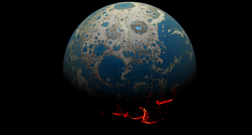 Mega-meteorites pelted early Earth. They would likely have created magma-gushing gashes (red lines in this artists’ rendition) and killed off any emerging life — until 4.3 billion years ago.