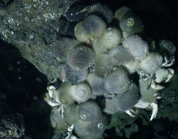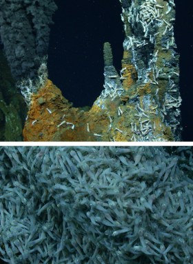 A community of animals camp out atop metal-rich sulfide ores at a hydrothermal vent 5 kilometers (3.1 miles) below the surface of the Caribbean Sea. The tiny dots in upper right are a new species of little brown snails. Bigger animals with shaggy ‘heads’ are anemones, which eat shrimp. Mini shrimps (lower center right) congregate by the dozens to thousands. The cottony white at center left is a mat of unusual bacteria.