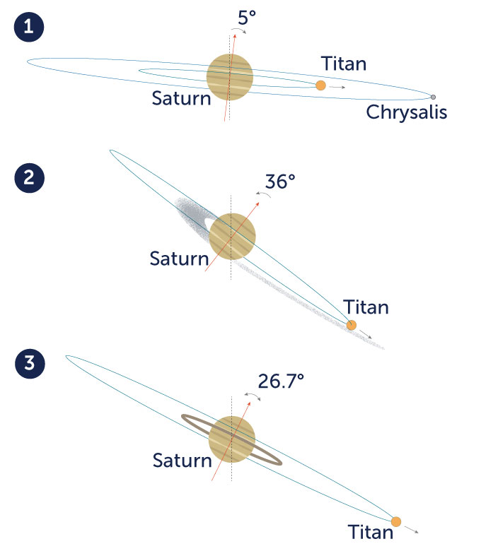 When Saturn formed, its spin axis was probably nearly straight up and down — like a top that has just been spun (1). But Titan, Saturn’s moon, gradually moved away from the planet. As a result, interactions between Titan, another moon called Chrysalis and the planet Neptune could have helped tilt Saturn. In fact, they could have tipped the planet over by 36 degrees (2). Chaos would ensue, leading to the destruction of Chrysalis. The shredded moon would form Saturn’s rings. Losing that moon also let Saturn’s tilt angle relax a bit to its present-day tilt, which is about 27 degrees (3).