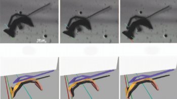 A musclebot (bottom left) consists of a bundle of muscle cells attached to a layer of gold, making the device look like a golden arch. This sequence of images shows how a musclebot takes a single step by contracting, then relaxing. The top row shows images of an actual musclebot in action, taken using a microscope. The bottom row illustrates what’s going on as the musclebot contracts and its back leg moves forward (middle), then relaxes to move its front leg forward (right). |