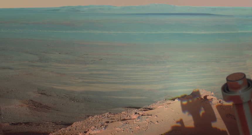 Opportunity didn’t just stumble upon the telltale minerals. A spacecraft orbiting Mars had snapped pictures of them on the crater rim. Raymond Arvidson and his coworkers sent the rover over to check the minerals out. A planetary geologist, Arvidson works at Washington University in St. Louis.