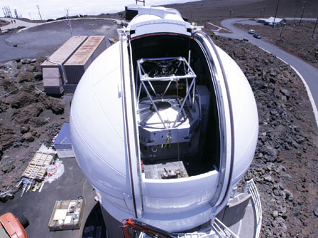 One of four planned Pan-STARRS telescopes has been built atop a Hawaiian mountain. Pan-STARRS will image the sky every night in search of large, near-Earth asteroids.